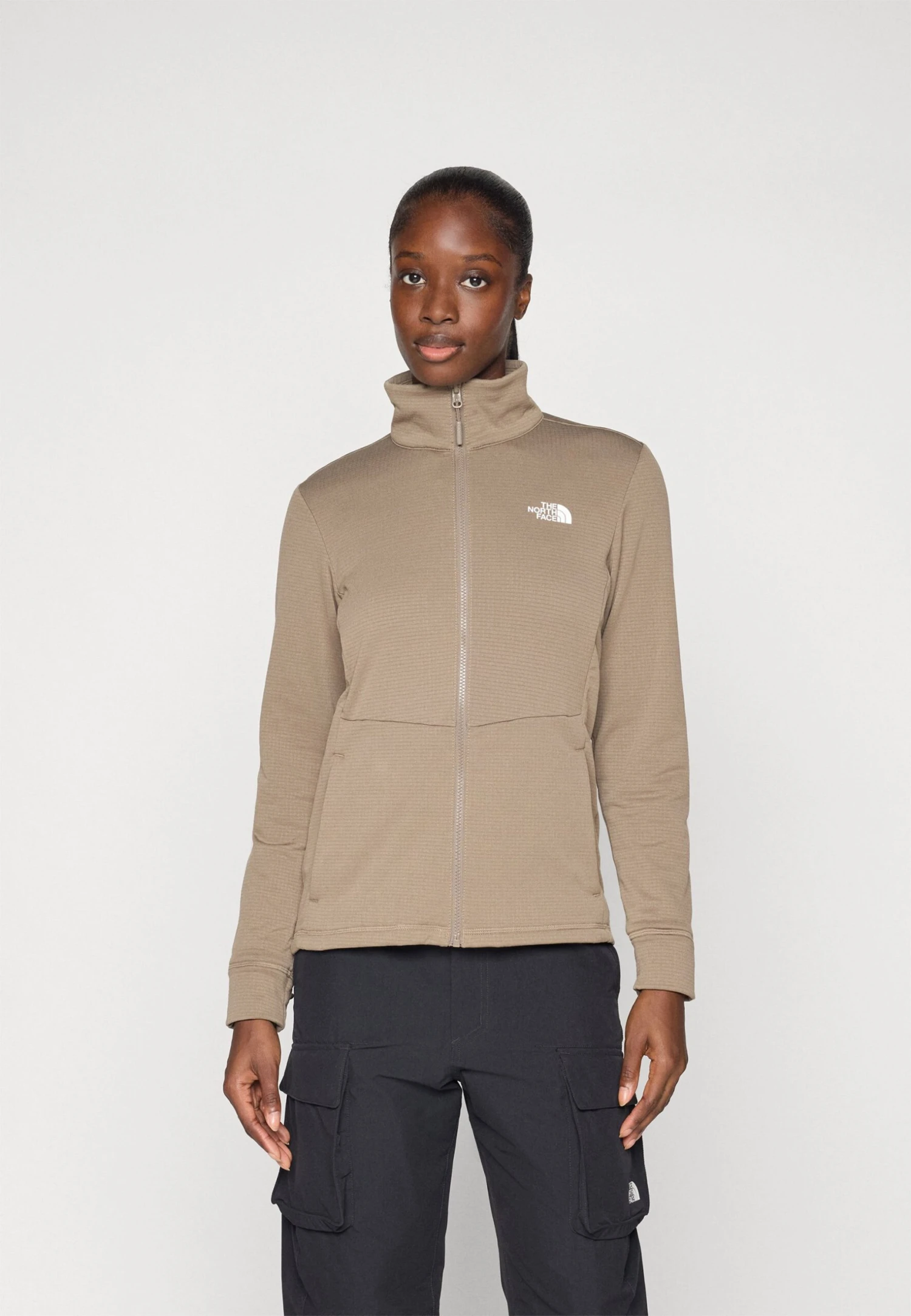 - Fastening: Continuous front zip, lined
